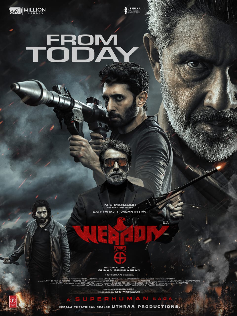 சத்யராஜ், வசந்த் ரவி இயக்குநர் ராஜீவ் மேனன், நடிகை தான்யா ஹோப், ராஜீவ் பிள்ளை, பிக்பாஸ் மாயா மற்றும் பலர் நடித்து நடித்து வெளியாகியிருக்டும் படம் ‘வெப்பன்’ இசை ஜிப்ரான் பிரபு ராகவ் ஒளிப்பதிவு , கோபி கிருஷ்ணா எடிட்டிங் .