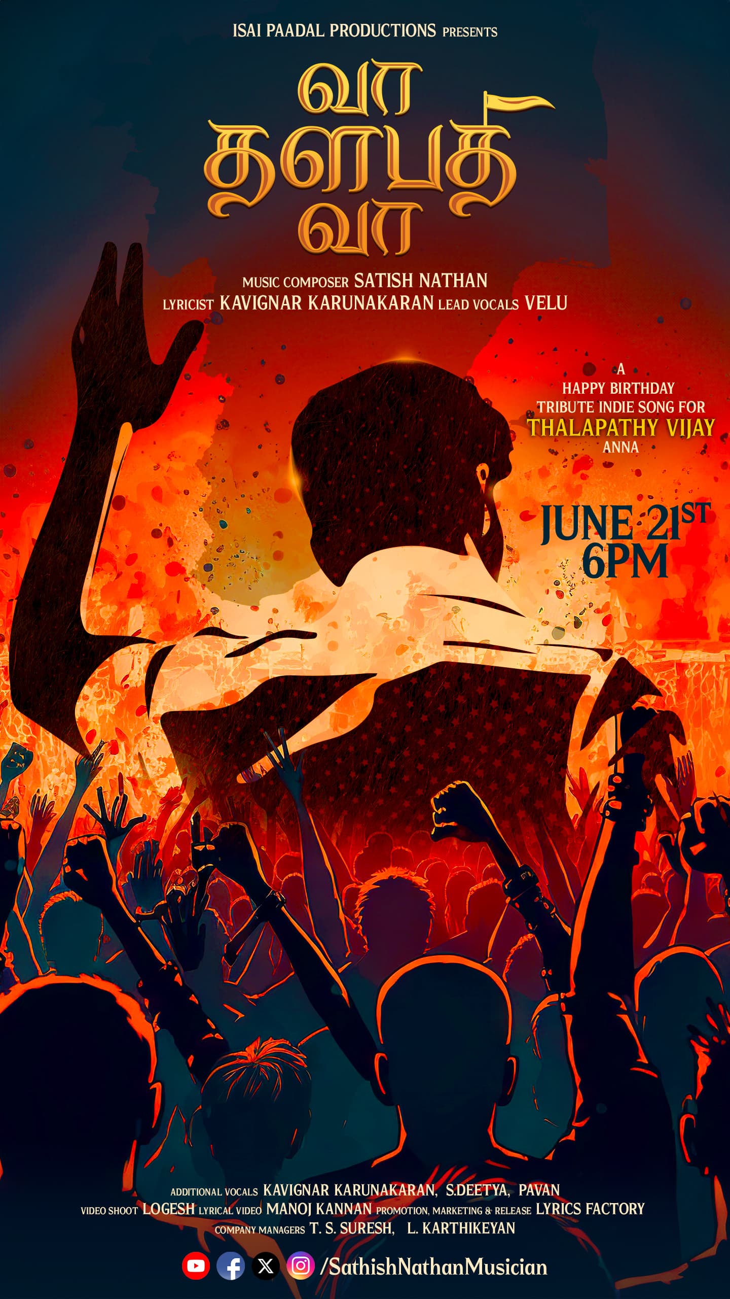 இசையமைப்பாளர் சதீஷ் நாதனின் இசையில் தளபதியின் பிறந்தநாளை முன்னிட்டு வரும் 21.6.2024 அன்று மாலை 6 மணி அளவில் ஒரு ரசிகனின் கனவாக #வாதளபதிவா என்ற தலைப்பில் பாடல் வெளியாகிறது.