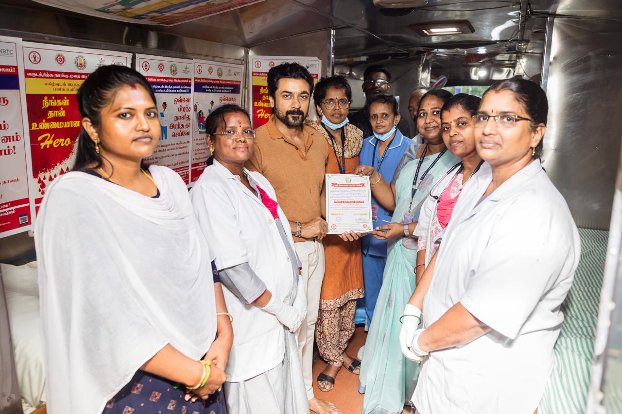 கடந்த ஆண்டு 2000க்கும் மேற்பட்டோர் சூர்யாவின் பிறந்த நாளை முன்னிட்டு இரத்த தானம் வழங்கினர். அவர்களை நேரில் அழைத்து விருந்தளித்து பாராட்டிய நடிகர் சூர்யா, இனி ஒவ்வொரு ஆண்டும் தானும் ரத்த தானம் செய்ய உள்ளதாக தெரிவித்திருந்தார். அதன் அடிப்படையில் நேற்று ரசிகர்கள் ரத்த தானம் செய்த நிலையில்,  இன்று அவர் ரத்த தானம் செய்து, ரசிகர்களுக்கும் நடிகர்களுக்கும் ஒரு முன்னுதாரணமாக திகழ்ந்துள்ளார்.