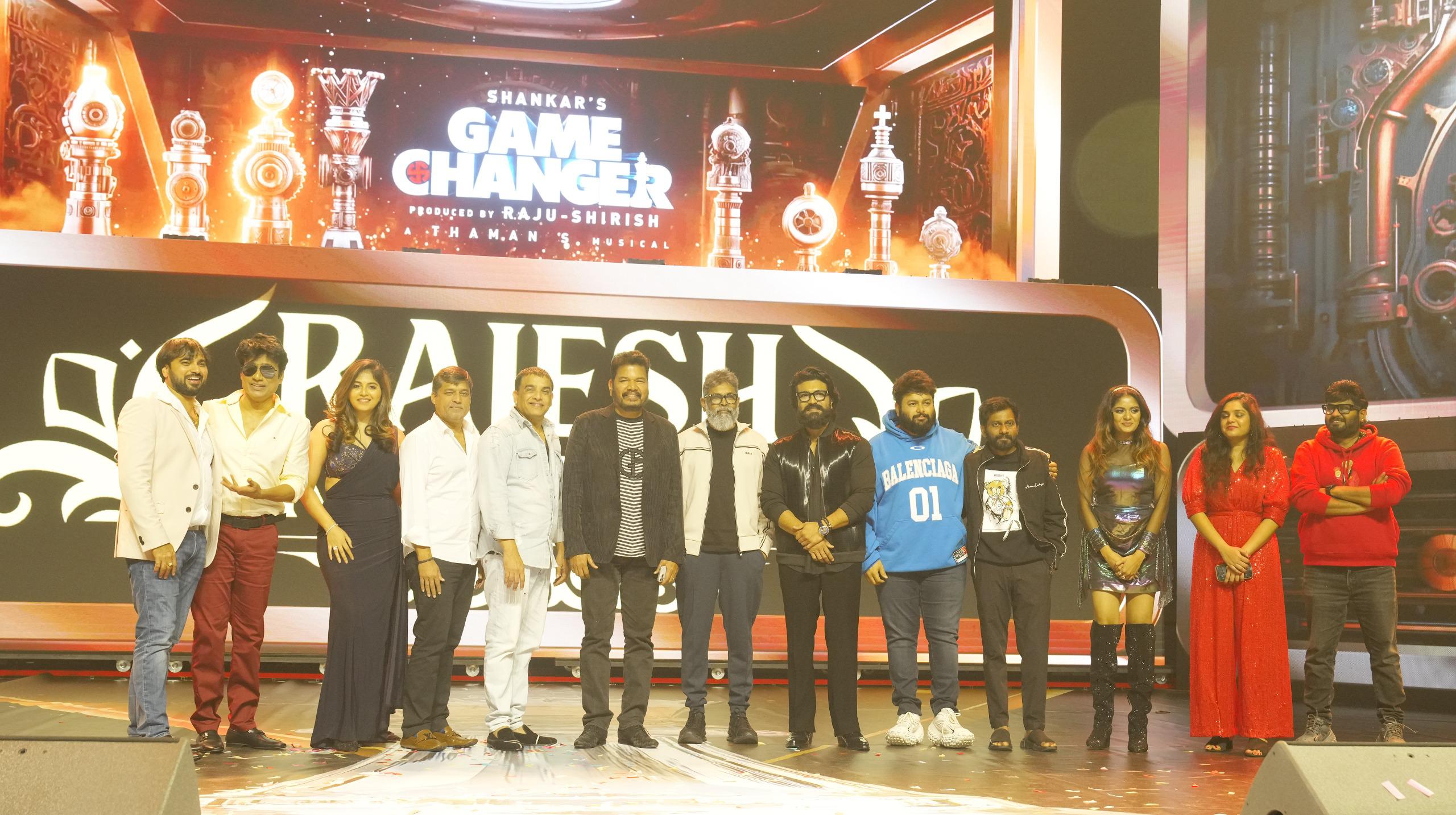 குளோபல் ஸ்டார் ராம் சரண், இயக்குநர் ஷங்கர், தயாரிப்பாளர்கள் தில் ராஜு, சிரிஷ், இசையமைப்பாளர் தமன், நடிகை அஞ்சலி உள்ளிட்ட படத்தின் முக்கிய குழுவினர் இவ்விழாவில் கலந்து கொண்டனர். குளோபல் ஸ்டார்  ராம் சரணுடன் அடுத்த திரைப்படத்தில் இணைந்து பணியாற்றவுள்ள இயக்குநர் சுகுமார் மற்றும் புச்சி பாபு சானா ஆகியோர் சிறப்பு விருந்தினர்களாக இவ்விழாவில் கலந்து கொண்டனர். இந்த அற்புதமான நிகழ்வை ராஜேஷ் கல்லேபள்ளி ஏற்பாடு செய்திருந்தார்.