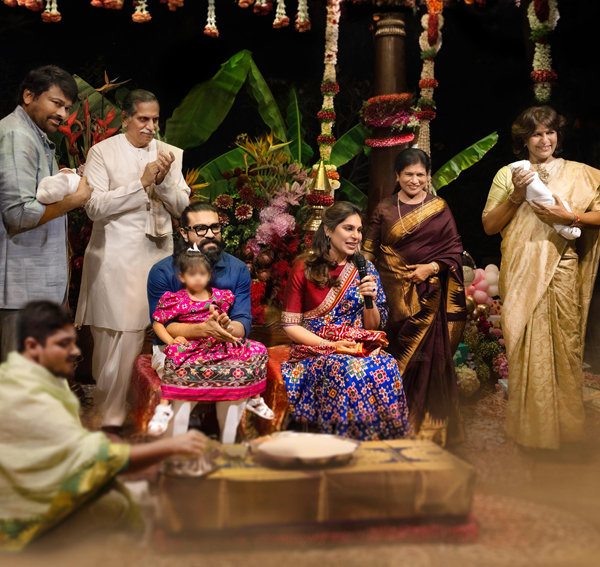 ஒரு குழந்தையை அளவில்லா பாசத்துடன் தாங்கியபடி சிரஞ்சீவி, உபாஸனாவின் தந்தையான அனில் காமினேனி அவர்களுடன் நிற்கிறார். அதே நேரத்தில், ” சுரேகா கொணிதெலா, உபாஸனாவின் தாயார் சோபனா காமினேனி அருகில் மற்றொரு குழந்தையை அன்புடன் தாங்கியபடி காட்சியளிக்கிறார். மூத்தோர் மற்றும் குடும்பத்தினரின் இந்த இணைவு, விழாவிற்கு பாரம்பரியமும் உணர்வுப்பூர்வமான அன்பையும் சேர்க்கிறது.
