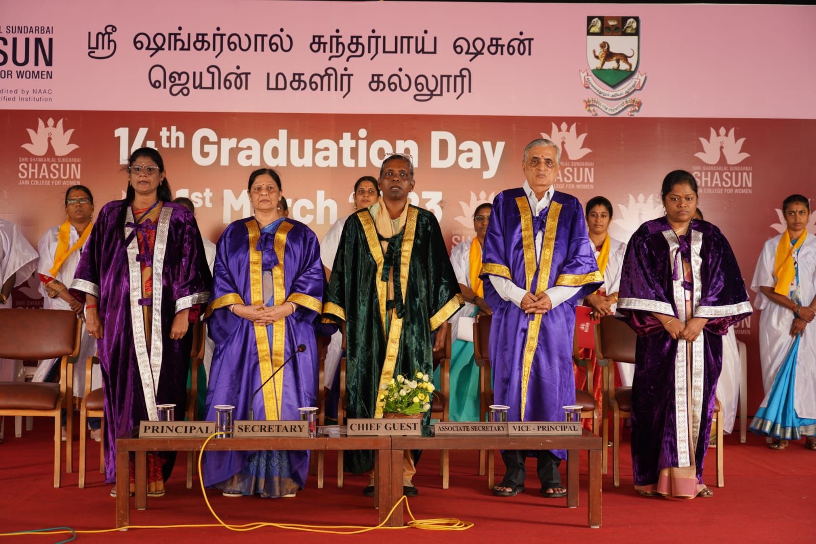 ஸ்ரீ ஷங்கர்லால் சுந்தர்பாய் ஷசுன் ஜெயின் மகளிர் கல்லூரியில் 14-ஆம் ஆண்டு பட்டமளிப்பு விழா  கல்லூரி வளாகத்தில் நடைபெற்றது. இதில் சென்னை, தமிழ்நாடு அரசின் மாநில புலனாய்வுத் துறை, குற்றப்பிரிவு குற்றப்புலனாய்வுத் துறையின் காவல் கண்காணிப்பாளர் திருமதி தேன்மொழி IPS அவர்களும் சென்னை அரசு மேலாண்மைத்துறையின் செயலர் திருமதி மைதிலி இராஜேந்திரன் IAS அவர்களும் சிறப்பு விருந்தினராகக் கலந்துகொண்டனர். கல்லூரிச் செயலர் ஸ்ரீமதி உஷா அபய ஸ்ரீஸ்ரீமால் அவர்கள் விழாவினைத் தொடங்கி வைக்க, கல்லூரி முதல்வர் முனைவர் சா.பத்மாவதி அவர்கள்  வரவேற்புரை நல்கினார்.