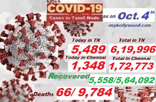 #Covid-19, #Coronavirus in Tamil Nadu – Latest News as on 4th Oct., Corona News By admin On Oct 9, 2020 388 Share தமிழகத்தில் கொரோனாவால் பாதிக்கப் பட்டவர்களின் எண்ணிக்கை 6,19,995-ஆக உயர்வு. இன்று மட்டும் 5,489 பேருக்கு கொரோனா பாதிப்பு உறுதிப்படுத்தப்படுள்ளது. தமிழகத்தில் ஏப்ரல் முதல் வாரத்தில் இருந்து கொரோனா பாதிக்கப்பட்டவர்களின் எண்ணிக்கை அதிகரித்த வண்ணமே இருந்தன. பாதிக்கப்பட்டவர்களின் எண்ணிக்கை 6,19,000–த்தை தாண்டியது. இன்று 5,489பேர் புதிதாக பாதிக்கப்பட்டனர். இதில் 1,348 பேர் சென்னை சேர்ந்தவர்கள் ஆவார்கள். இதனால் சென்னையில் பாதிக்கப் பட்டவர்களின் எண்ணிக்கை 1,72,773 இன்றைய 5,489 எண்ணிக்கையுடன் ஒட்டுமொத்தமாக தமிழகத்தில் இதுவரை 6,19,996 பேர் கொரோனாவால் பாதிக்கப்பட்டுள்ளனர். இன்று 5,558 பேர் குணமடைந்து வீடு திரும்பியுள்ளனர். இதுவரை மொத்தமாக 5,64,092பேர் குணமடைந்து வீடு திரும்பியுள்ளனர். இறப்பு –66/ 9,784 388 Share
