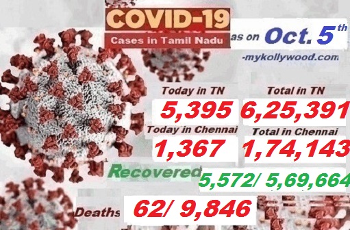 #Covid-19, #Coronavirus in Tamil Nadu – Latest News as on 5th Oct., Corona News By admin On Oct 9, 2020 374 Share தமிழகத்தில் கொரோனாவால் பாதிக்கப் பட்டவர்களின் எண்ணிக்கை 6,25,391-ஆக உயர்வு. இன்று மட்டும் 5,395 பேருக்கு கொரோனா பாதிப்பு உறுதிப்படுத்தப்படுள்ளது. தமிழகத்தில் ஏப்ரல் முதல் வாரத்தில் இருந்து கொரோனா பாதிக்கப்பட்டவர்களின் எண்ணிக்கை அதிகரித்த வண்ணமே இருந்தன. பாதிக்கப்பட்டவர்களின் எண்ணிக்கை 6,25,000–த்தை தாண்டியது. இன்று 5,395 பேர் புதிதாக பாதிக்கப்பட்டனர். இதில் 1,367 பேர் சென்னை சேர்ந்தவர்கள் ஆவார்கள். இதனால் சென்னையில் பாதிக்கப் பட்டவர்களின் எண்ணிக்கை 1,74,143 இன்றைய 5,395 எண்ணிக்கையுடன் ஒட்டுமொத்தமாக தமிழகத்தில் இதுவரை 6,25,391 பேர் கொரோனாவால் பாதிக்கப்பட்டுள்ளனர். இன்று 5,572 பேர் குணமடைந்து வீடு திரும்பியுள்ளனர். இதுவரை மொத்தமாக 5,69,664 பேர் குணமடைந்து வீடு திரும்பியுள்ளனர். இறப்பு –62/ 9,846 374 Share