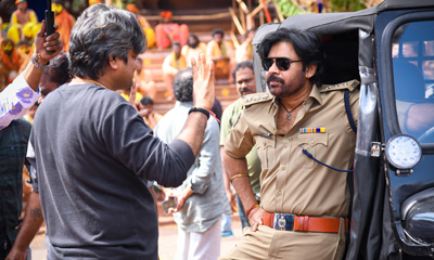 Pawan Kalyan looks macho in these posters in the khaki dress with black shades on. He is seen having a serious conversation with director Harish Shankar in one poster, whereas he is seen walking on the set fiercely in another picture.